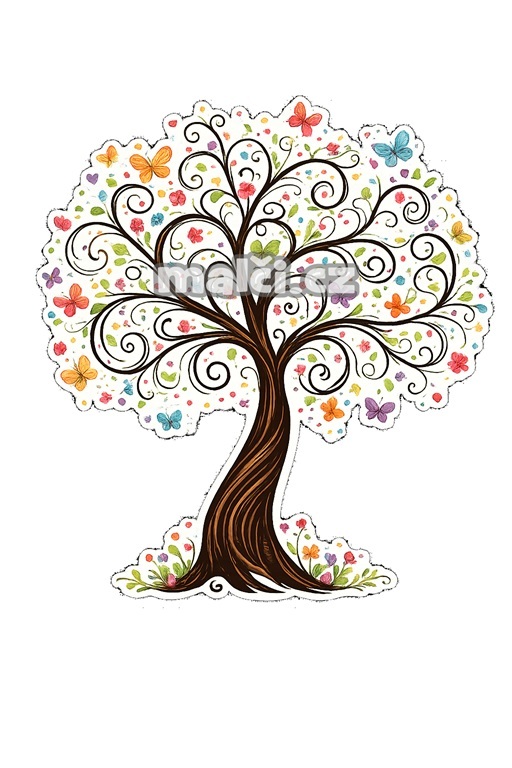 Roztomilá ilustrace plná barev, jemnosti a radostné atmosféry. Hlavním motivem je kouzelný strom s elegantně zatočenými větvemi, které jsou ozdobené drobnými kvítky, lístky a pestrobarevnými motýly.