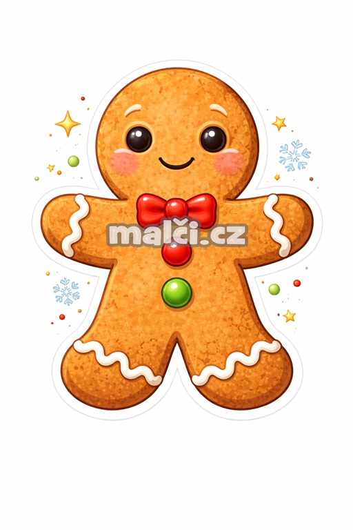 Roztomilá digitální ilustrace usměvavého vánočního perníčku s červenou mašlí a barevnými knoflíčky, který okamžitě navodí hřejivou sváteční atmosféru. Přátelský výraz, kulatá očka a jemné zdobení cukrovou polevou dělají z tohoto perníčka ideální vánoční motiv plný radosti a pohody.