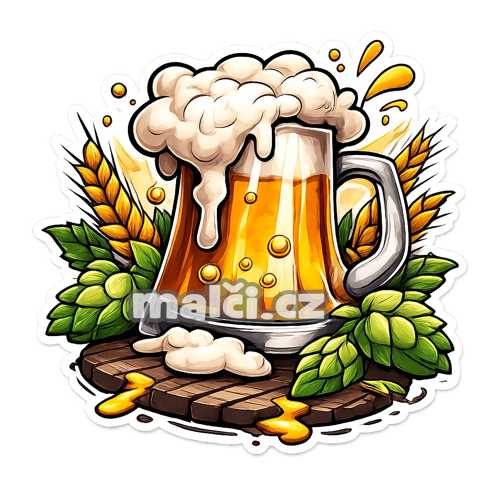 Roztomilá digitální ilustrace zlatavého půllitru piva s bohatou pěnou, zasazeného do stylizované kompozice s klasy obilí, chmelem a dřevěným podstavcem. Ilustrace působí hravě, výrazně a poctivě řemeslně, přičemž v sobě spojuje klasickou pivní atmosféru s dekorativním kresleným stylem.