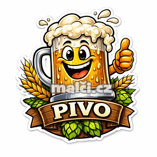 Roztomilá digitální ilustrace zlatavého půllitru piva s bohatou pěnou, veselým obličejem a zdviženým palcem, zasazeného do stylizované kompozice s klasy obilí, chmelem a dřevěnou cedulkou s nápisem PIVO. Motiv působí hravě, výrazně a poctivě řemeslně, přičemž spojuje klasickou pivní atmosféru s dekorativním kresleným stylem.