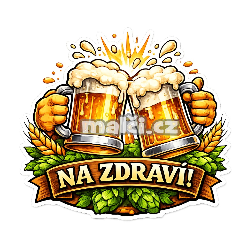 Veselá a energická ilustrace dvou zlatavých půllitrů piva, které si přiťukávají na zdraví. Pěna přetéká, kapky piva stříkají do všech stran a celý motiv doplňuje nápis „NA ZDRAVÍ!“ na stylové dřevěné ceduli obklopené chmelem a obilím.