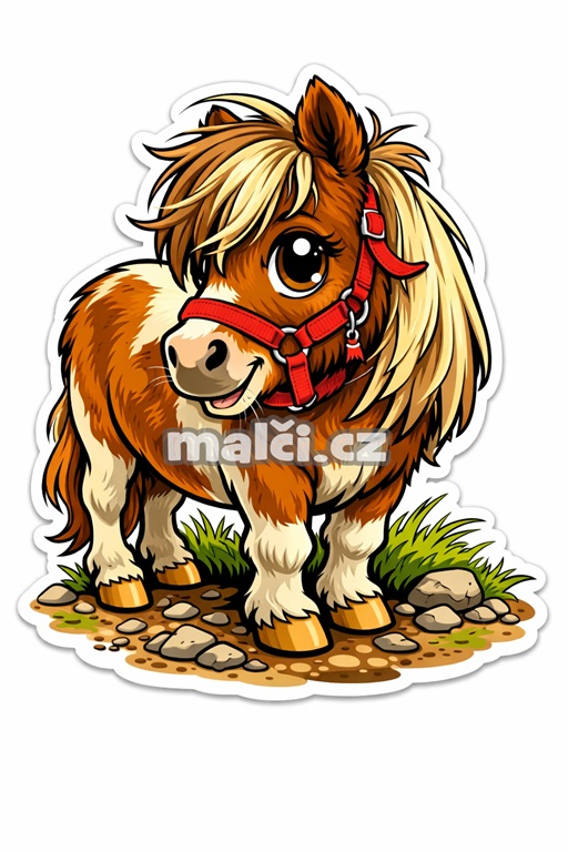Roztomilá stylizovaná ilustrace poníka zachycuje tohoto malého koně v hravém, lehce karikaturním stylu. Teplé odstíny hnědé srsti doplňuje světlá hříva a výrazná červená ohlávka, díky čemuž ilustrace působí živě, přívětivě a veselým dojmem.