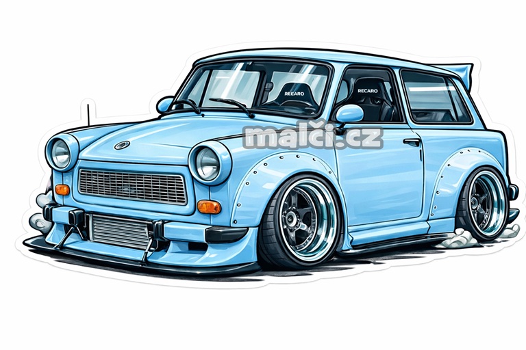 Stylová digitální ilustrace ikonického vozu Trabant v moderním tuningovém stylu. Retro design legendárního „Trabiho“ je doplněn o široká sportovní kola, rozšířené blatníky a výrazně snížený stance podvozek, který dodává vozu agresivní a dynamický vzhled.