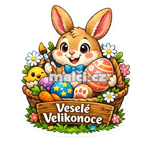 Roztomilá velikonoční ilustrace s veselým zajíčkem, který sedí v proutěném košíku plném barevných kraslic. V ruce drží štětec a jednu z vajíček právě zdobí – celý motiv tak působí hravě a živě. Dominantou je dřevěná cedulka s nápisem „Veselé Velikonoce“, doplněná jarními květinami a svěží zelení.
