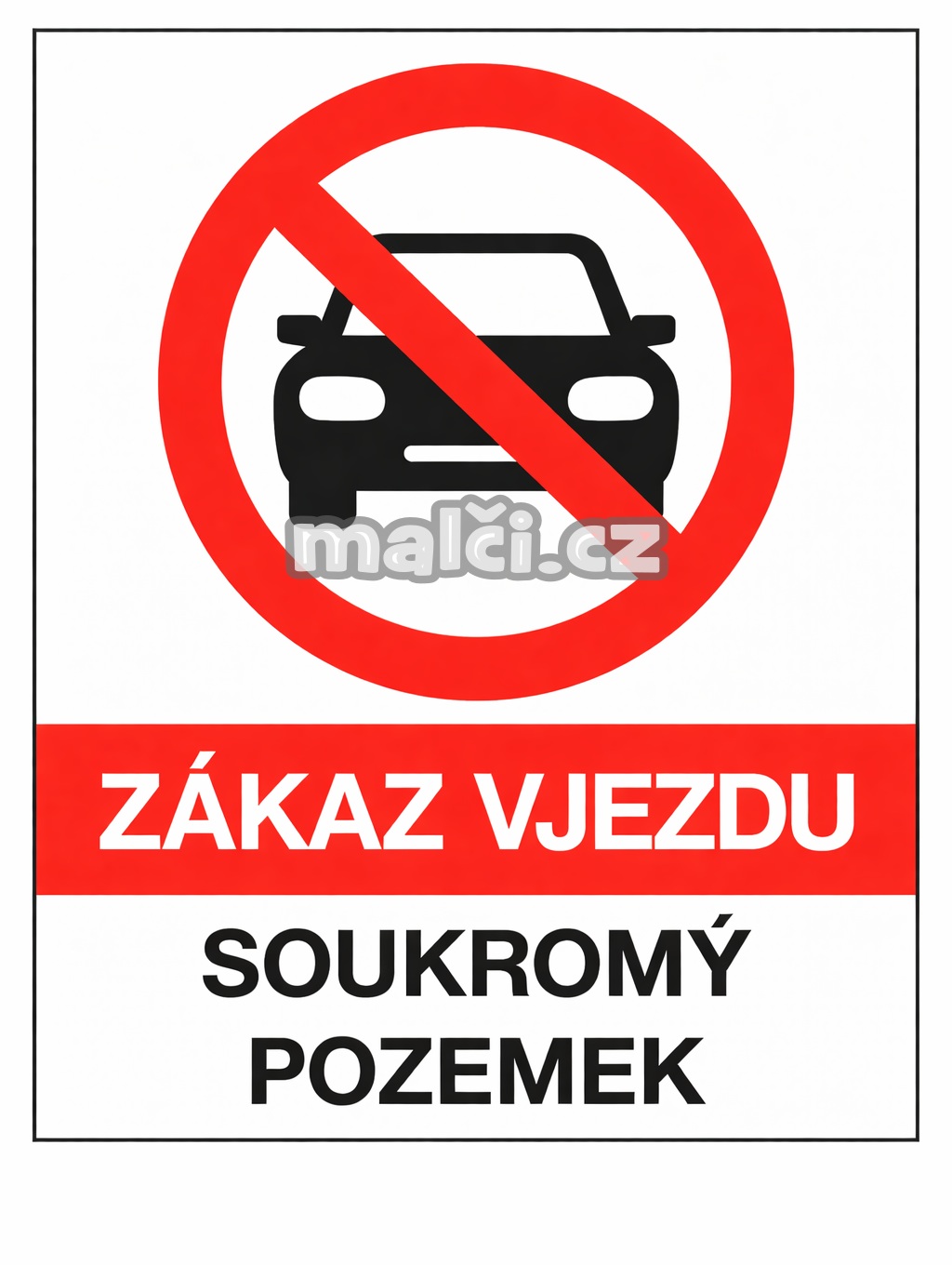 Výrazná cedule se symbolem zákazu vjezdu jasně říká jediné: sem autem nejezdi. Jednoduchý, ale velmi účinný vizuál s piktogramem auta a červeným zákazovým kruhem okamžitě upoutá pozornost a je srozumitelný na první pohled.