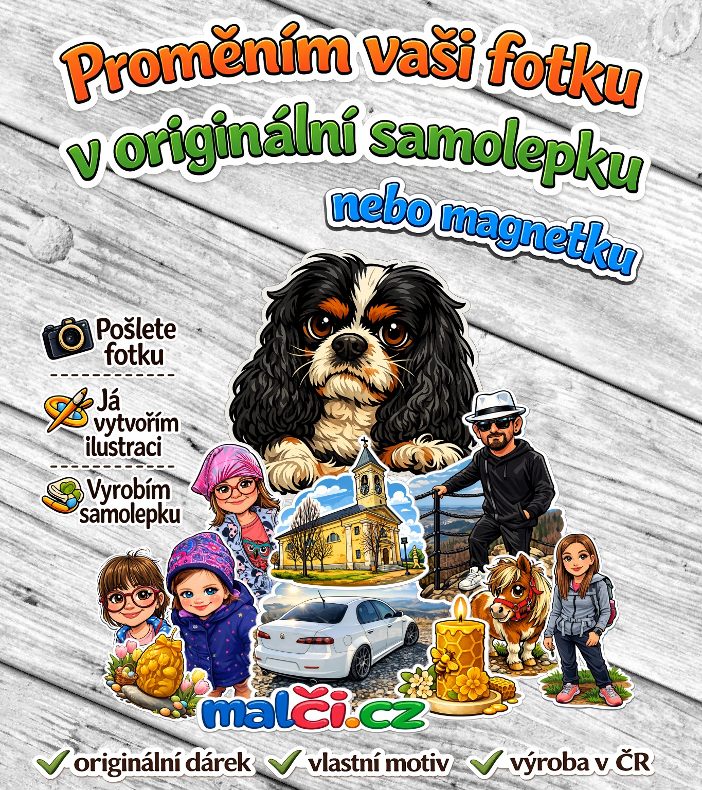 📸 Pošlete fotku → my vytvoříme ilustraci → odešleme náhled ke schválení → vyrobíme samolepku, magnetku nebo dočasnou tetovačku.