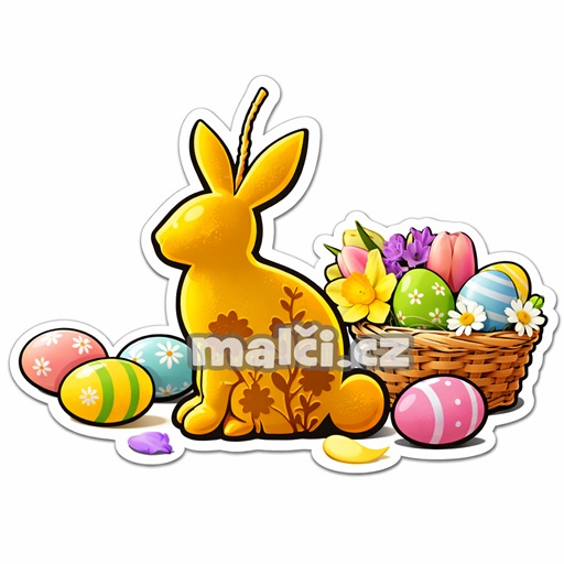 Zajíček s měkkými, oblými tvary působí klidně, něžně a harmonicky. Jemně naznačený knot v horní části hlavičky symbolizuje světlo, nový začátek a jarní energii. Košík s květinami a vajíčky dodává ilustraci radostný velikonoční nádech, pocit hojnosti a sváteční pohody.