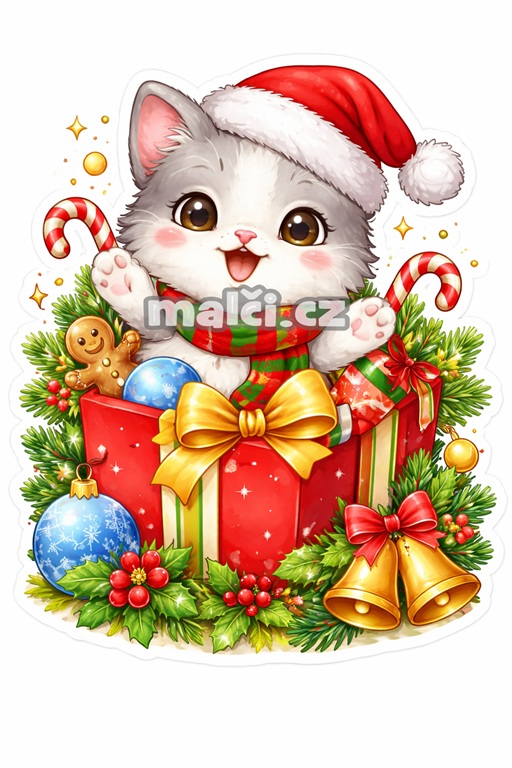 Roztomilá digitální ilustrace usměvavé vánoční kočičky, která vykukuje z velkého červeného dárku se zlatou mašlí. Kočička má na hlavě čepičku, kolem krku červeno-zelenou šálu a v tlapkách drží cukrové hůlky. Celý motiv působí hravě, něžně a okamžitě navodí kouzelnou vánoční atmosféru.