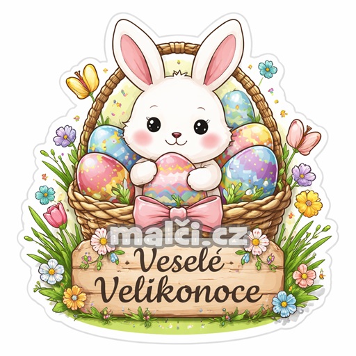 Roztomilá velikonoční ilustrace s usměvavým bílým zajíčkem, který sedí v proutěném košíku plném barevně zdobených kraslic. Dominantou motivu je dřevěná cedulka s výrazným nápisem „Veselé Velikonoce“, doplněná bohatou jarní květinovou výzdobou a jemnými dekorativními detaily.