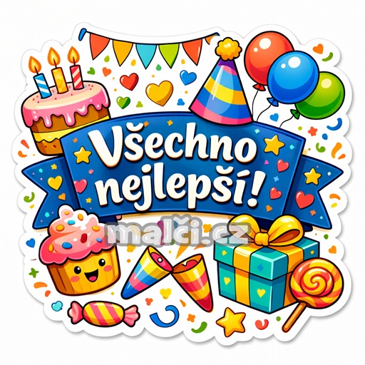 Roztomilá narozeninová ilustrace plná barev, radosti a oslavné nálady. Hlavním motivem je veselý nápis „Všechno nejlepší“ doplněný o narozeninovou čepičku, barevné balónky, dárky, dortík se svíčkou a drobné hvězdičky.